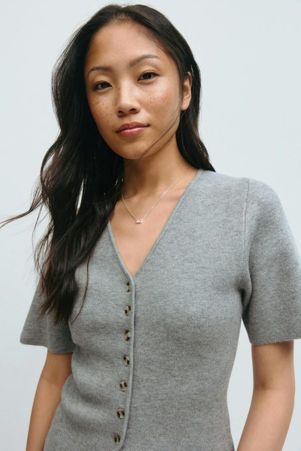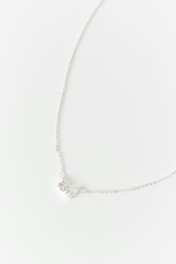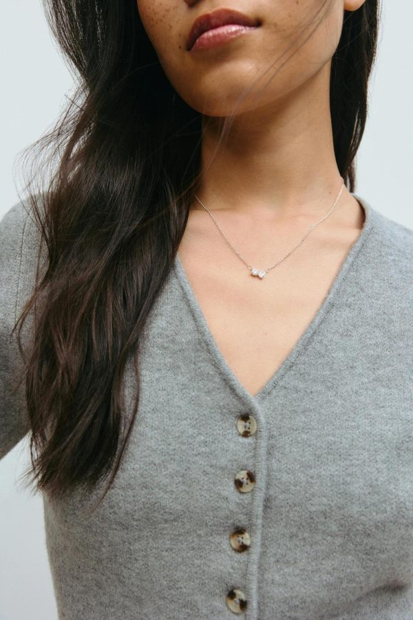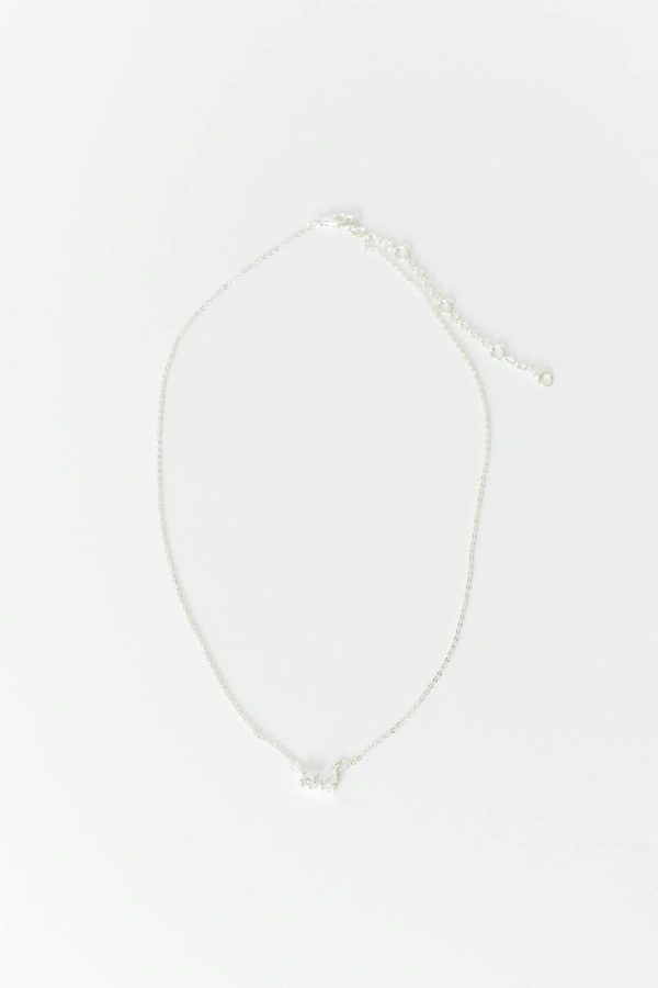 Halsband med berlocker. Smycket är silverfärgat och har en tunn kedja. Det har ett klolås.