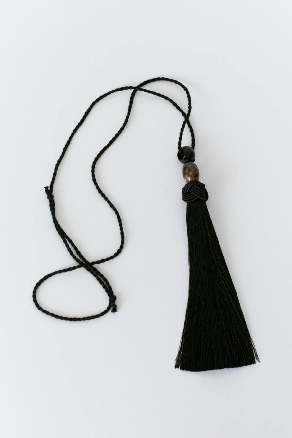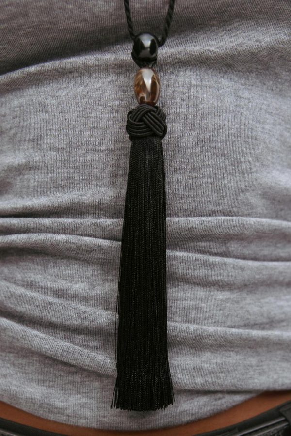 Långt halsband med tofs nedtill. Smycket är svart och har pärlor.
