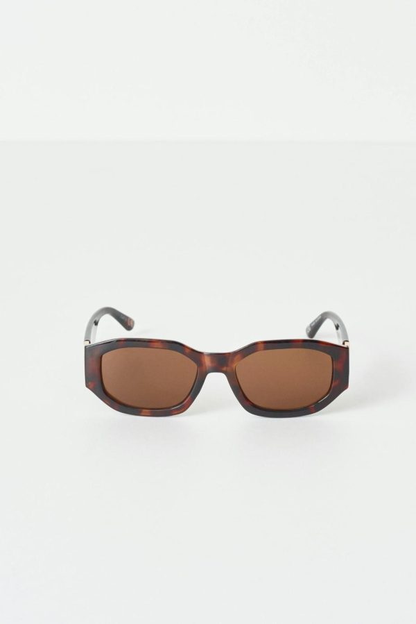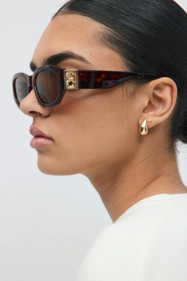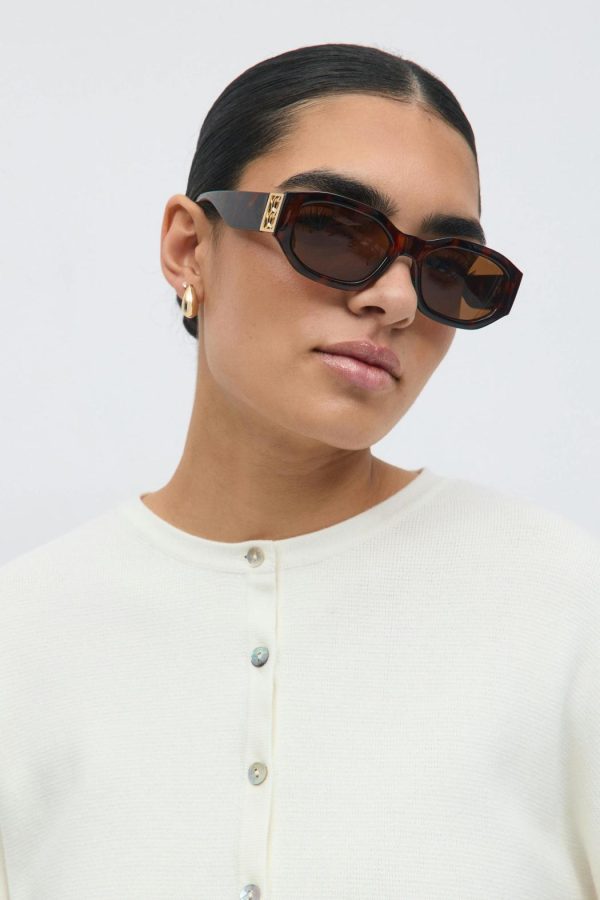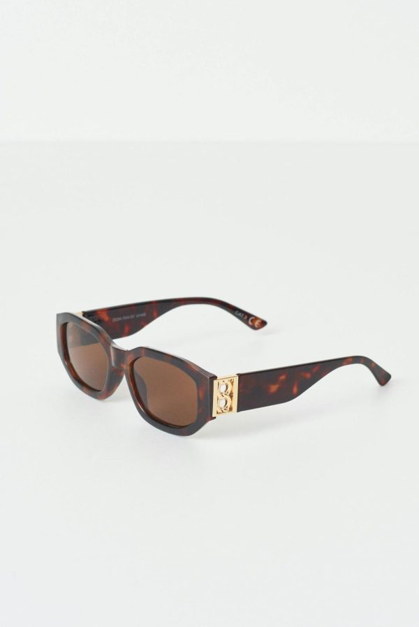 Solglasögon med breda plastbågar. Solglasögonen är bruna och har gulddetaljer i sidorna.
