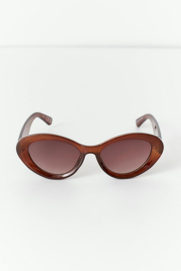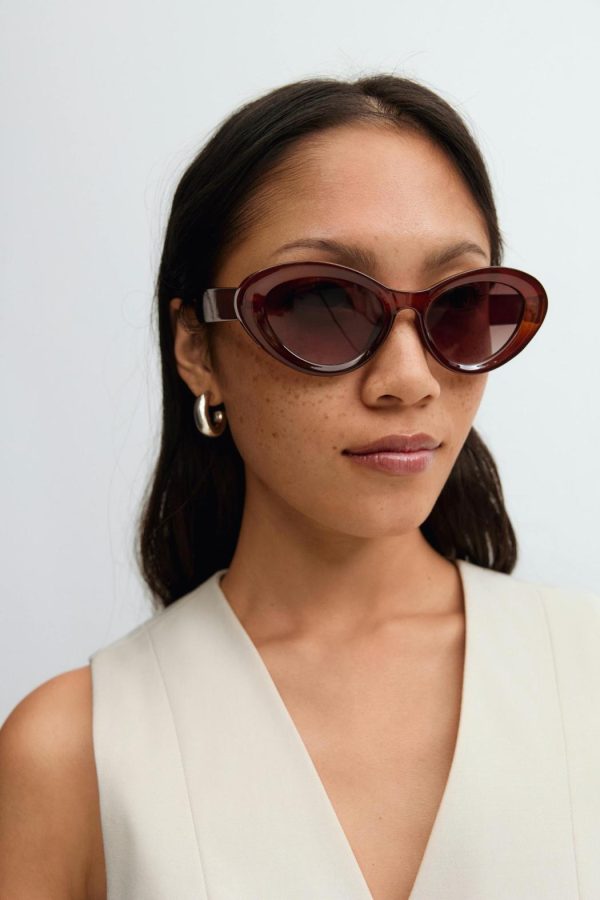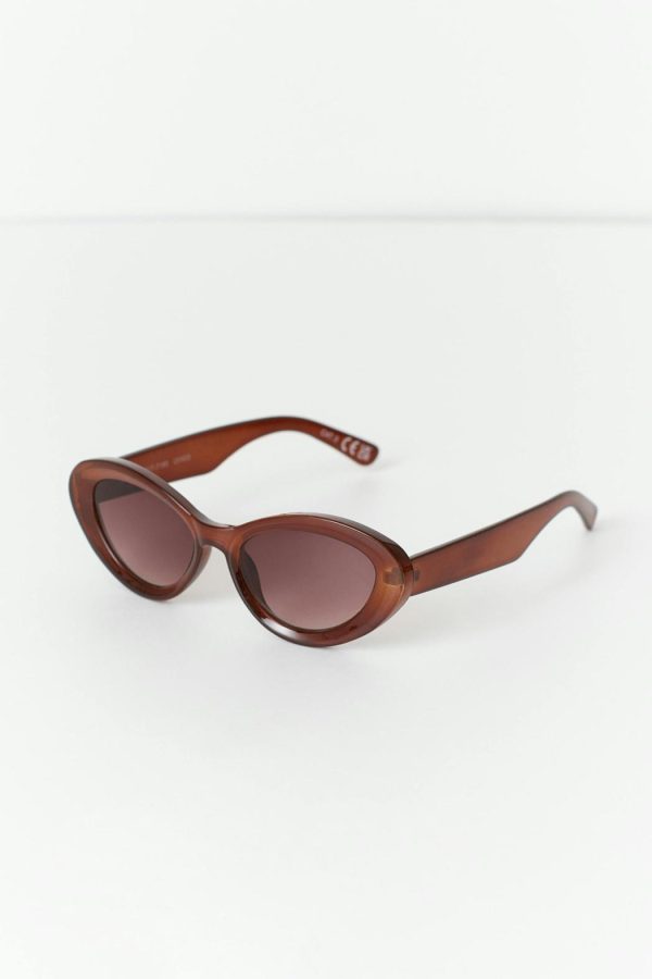 Ovala solglasögon med cateye-design. Solglasögonen är bruna och har plastbågar.