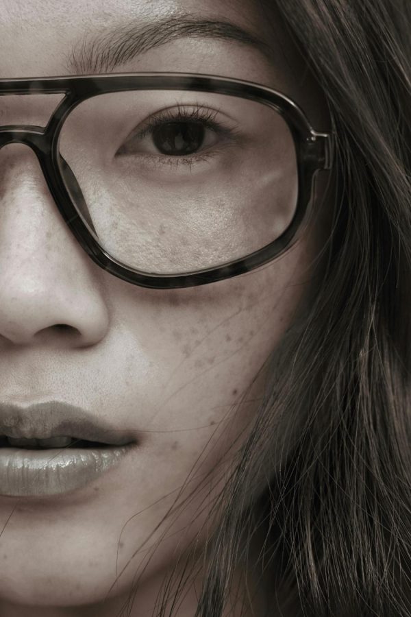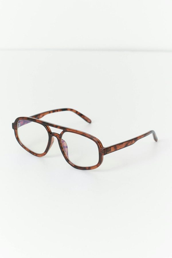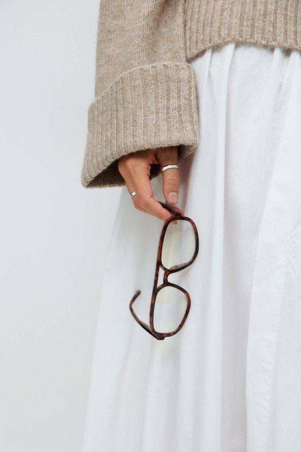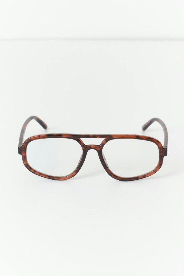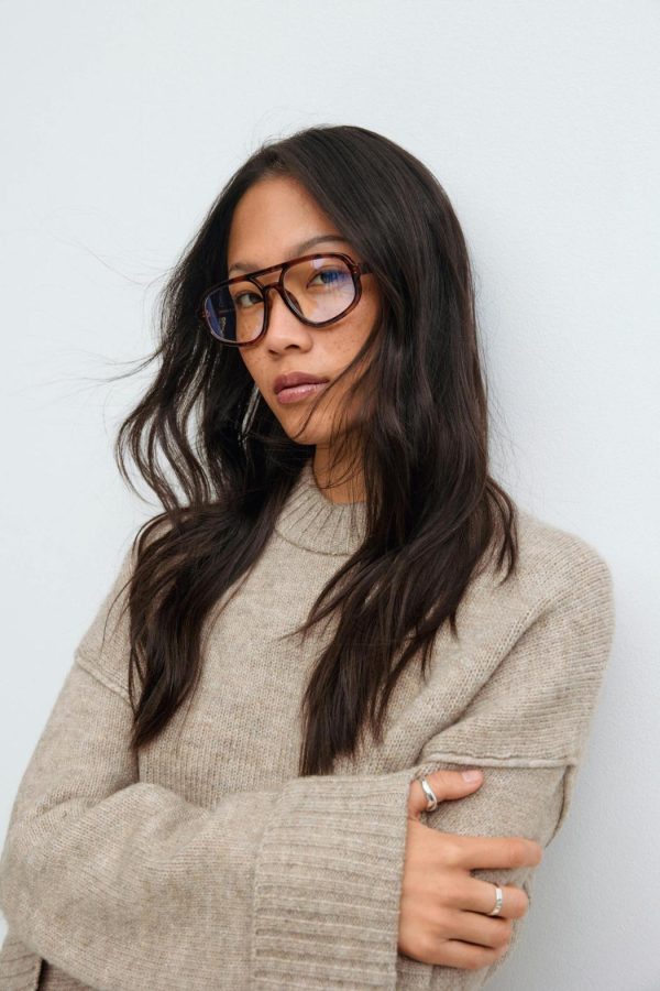 70-talsinspirerade glasögon med sköldpaddsmönstrade bågar i 100% återvunnen plast. Glasögonen är bruna. Linserna har en specialbeläggning som filtrerar bort skadligt blått ljus från digitala skärmar.