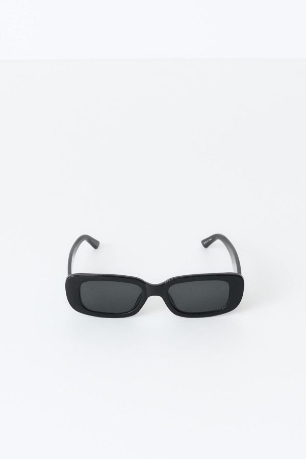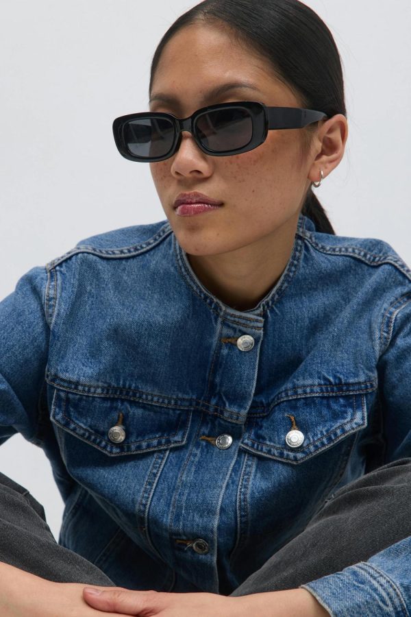 Rektangulära solglasögon med plastbågar i återvunnen plast. Solglasögonen är svarta och har tonade glas med ett UV400-skydd.