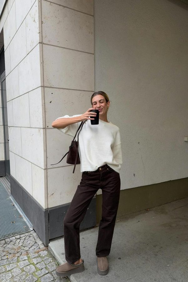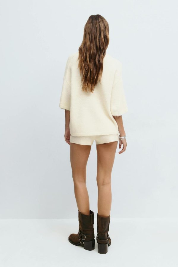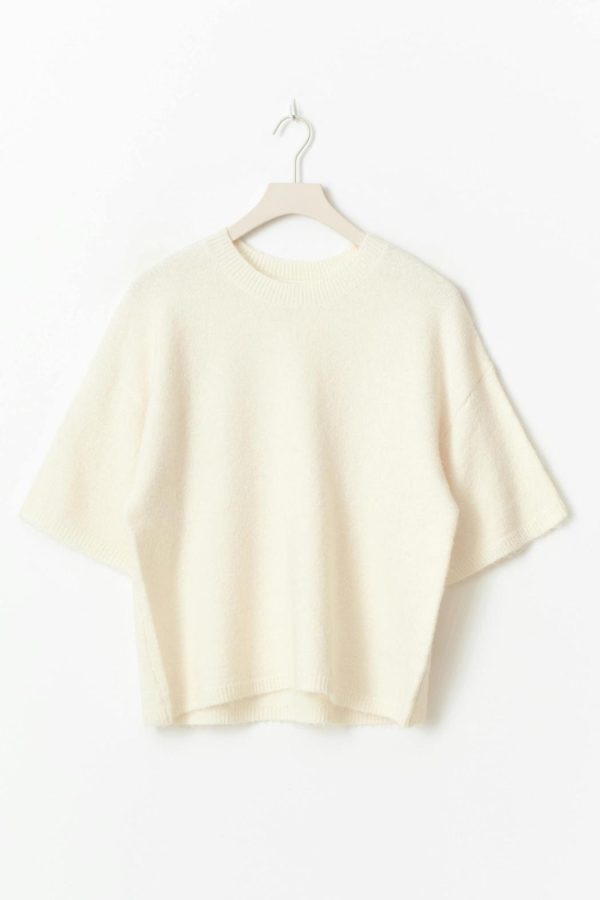 Kortärmad stickad tröja med oversize fit. Tröjan är vit och har rund halsringning. Den har finstickad kvalitet och ribbad mudd i nederkant, vid ärmslut och kring halsringning.