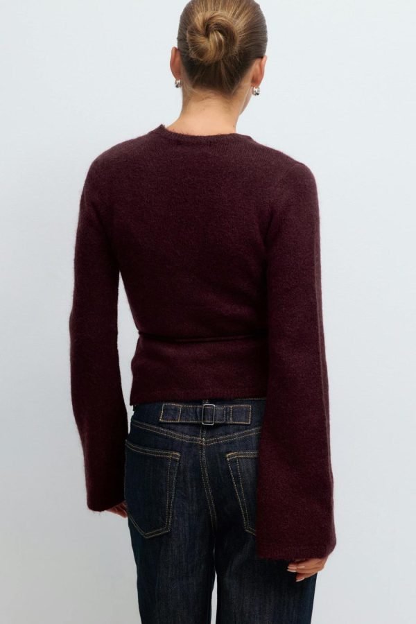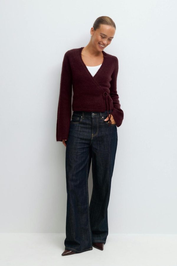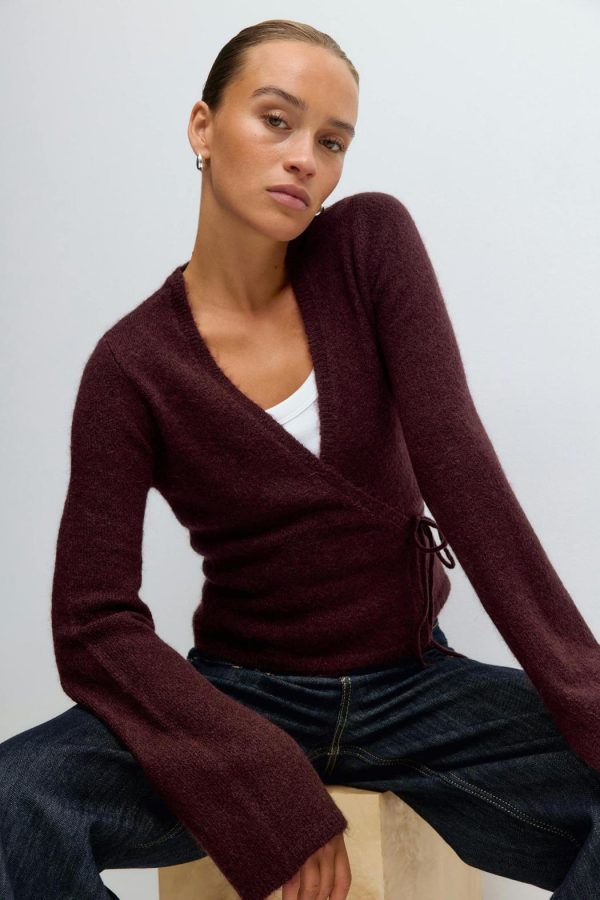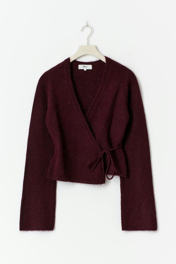 Stickad omlottkofta i ullblandning med knytning i midjan. Koftan är vinröd och har v-ringning. Den har långa ärmar, normal passform och finstickad kvalitet.