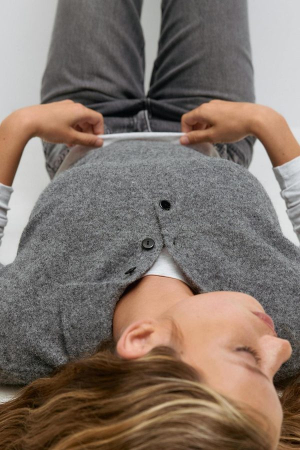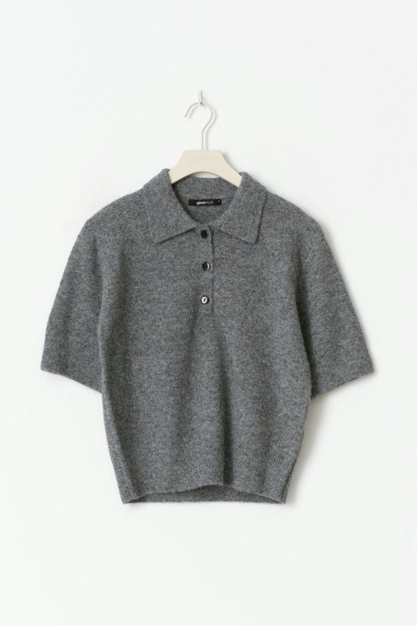 Stickad tröja med korta ärmar. Tröjan är grå och har en rund halsringning med krage. Den har knappar upptill och en ribbmudd vid ärmsluten och i nederkant.