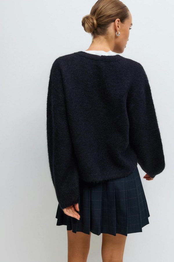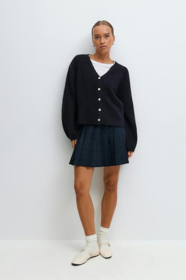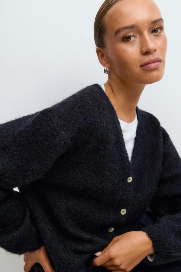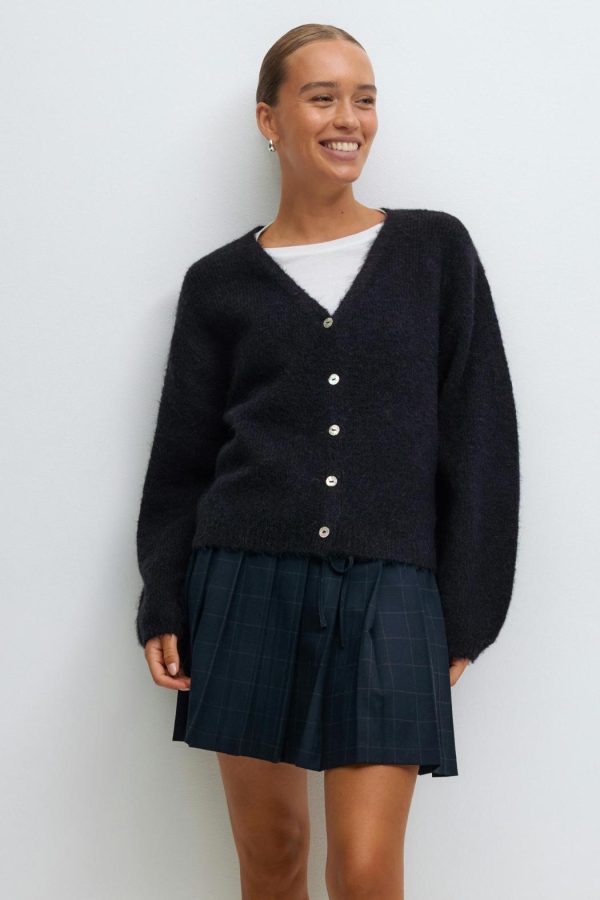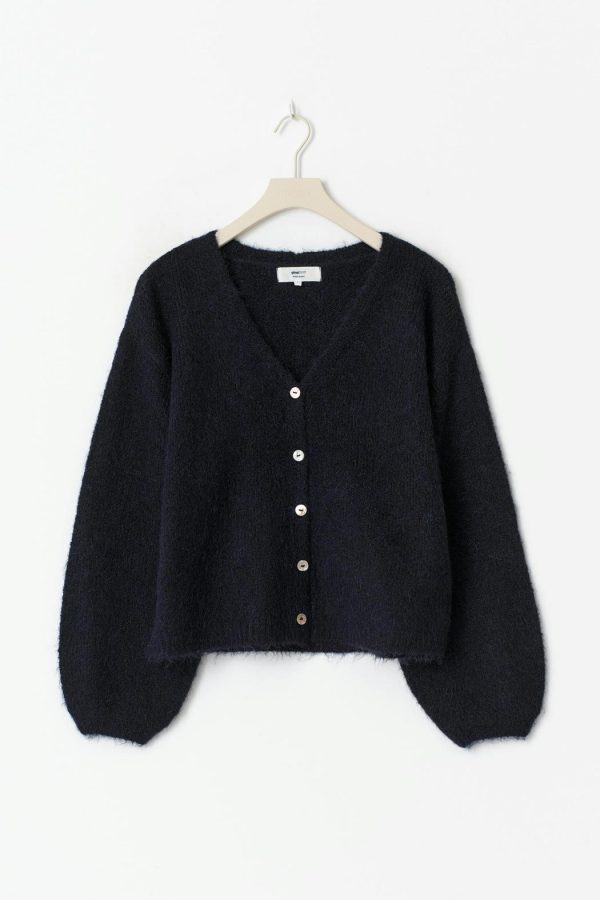 Stickad kofta i ullblandning med lös passform. Cardigan är marinblå och har v-ringning. Den har knappar framtill, lång ärm och ribbstickning vid ärmslut och i nederkant.