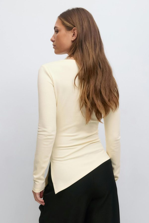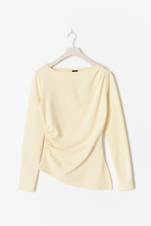 Asymmetrisk topp med rynkningar i sidan och på axeln. Toppen är beige och har långa ärmar. Den har intagen midja, kort längd, båtringning och slits i sidan.