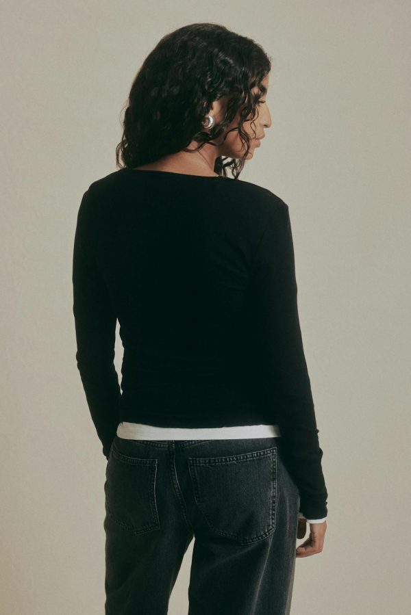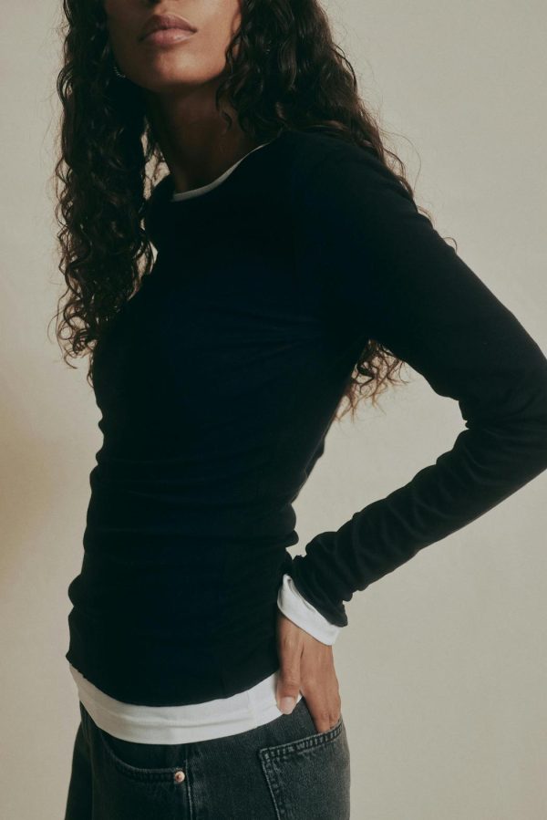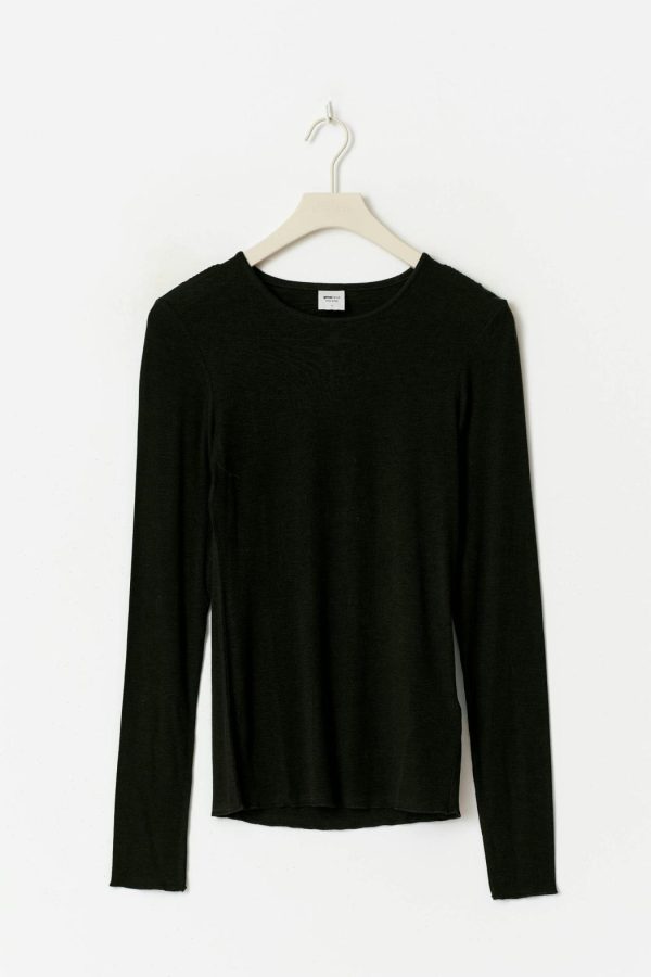Långärmad topp i ullblandning med skir kvalitet. Toppen är svart och har rund halsringning. Den har normallängd och figurnära passform.