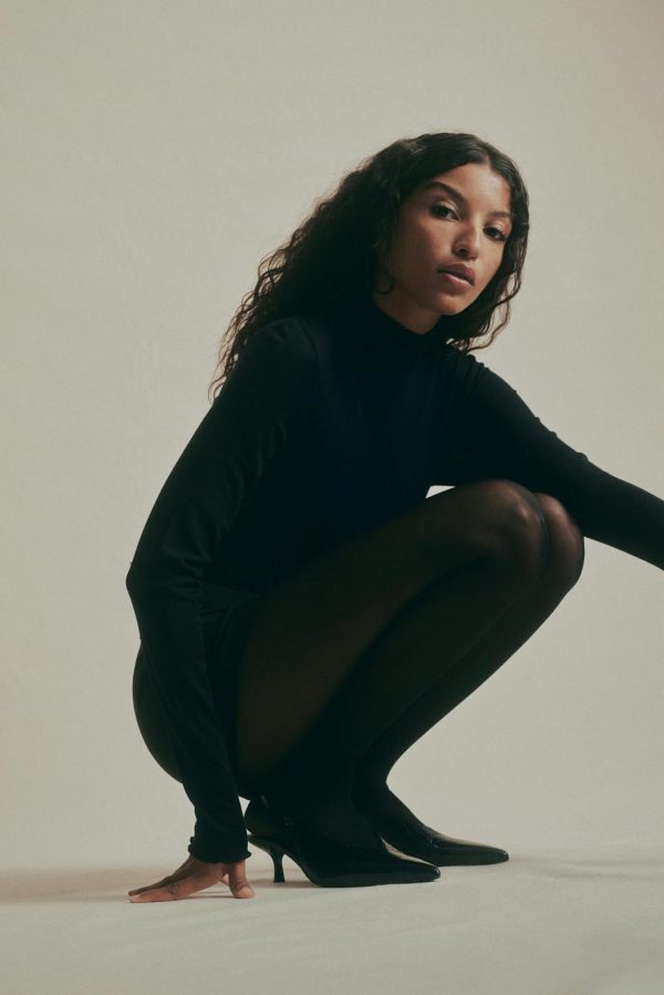 Långärmad polotopp i ullblandning med skir kvalitet. Toppen är svart och har figurnära passform. Den har hög krage och vågig fåll.