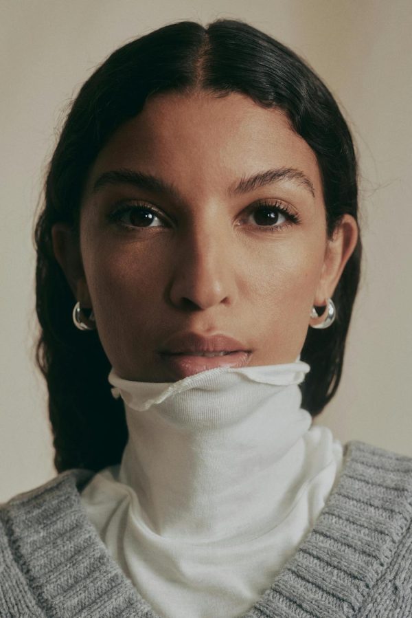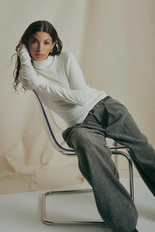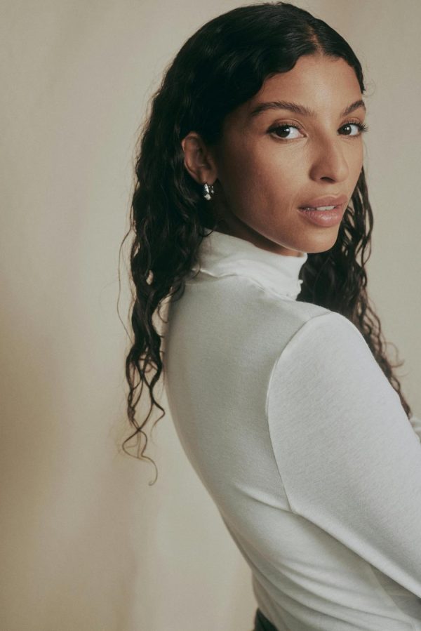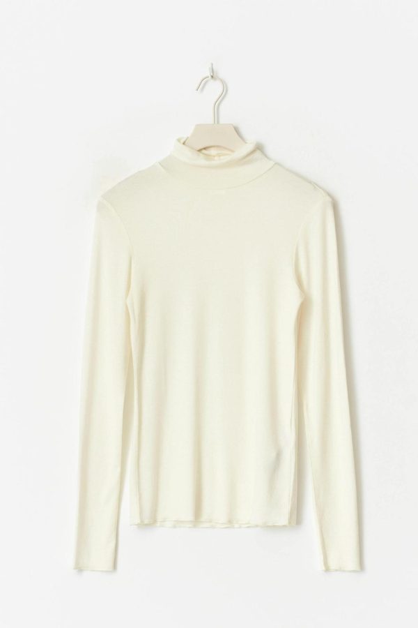 Långärmad polotopp i ullblandning med skir kvalitet. Toppen är vit och har figurnära passform. Den har hög krage och vågig fåll.