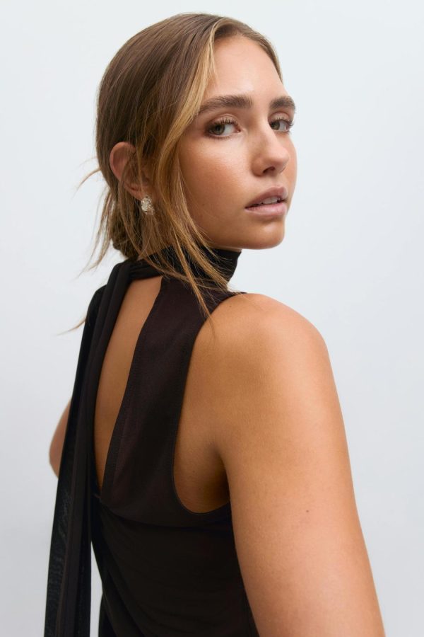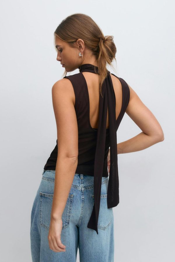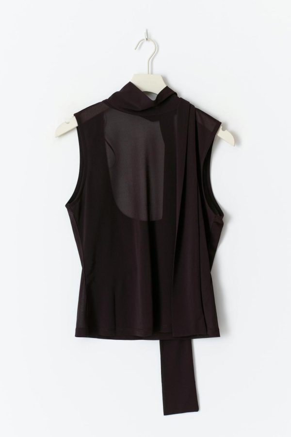 Ärmlös topp med scarfdetalj. Toppen är brun och har öppen rygg. Den har hög halsringning, transparent material och normal passform.