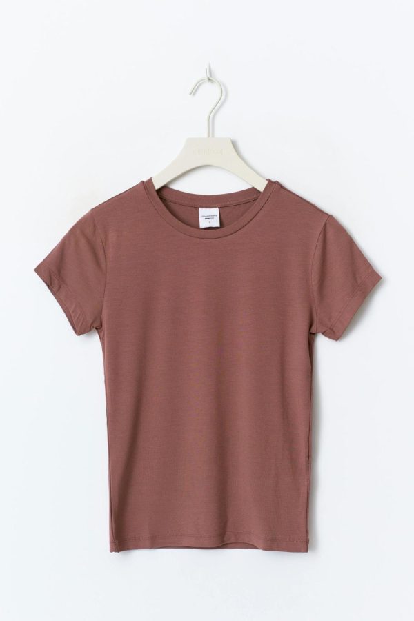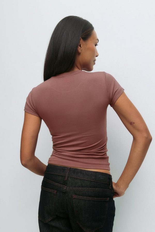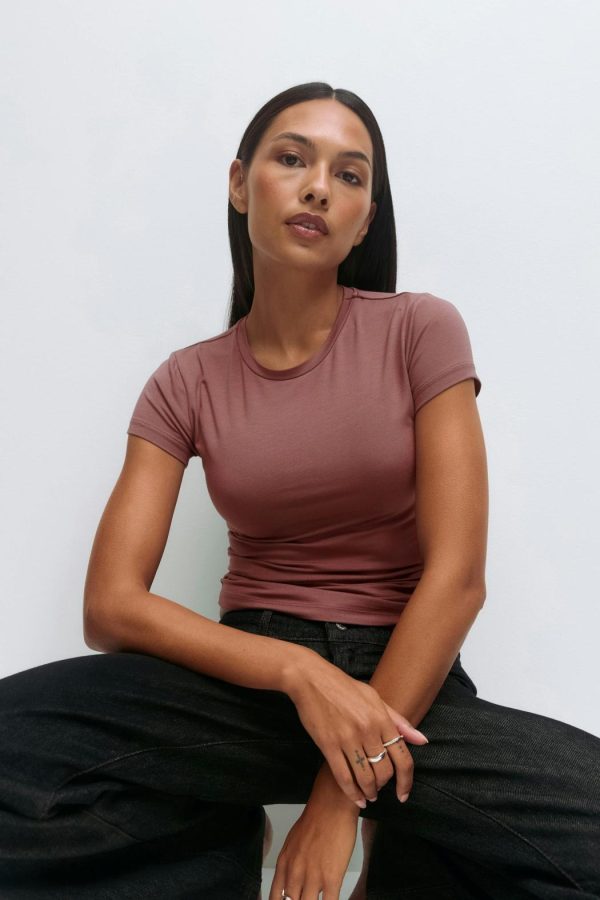 Tight t-shirt i mjuk viskos med rund halsringning. T-shirten har kort ärm. Den har normallängd och figurnära passform.
