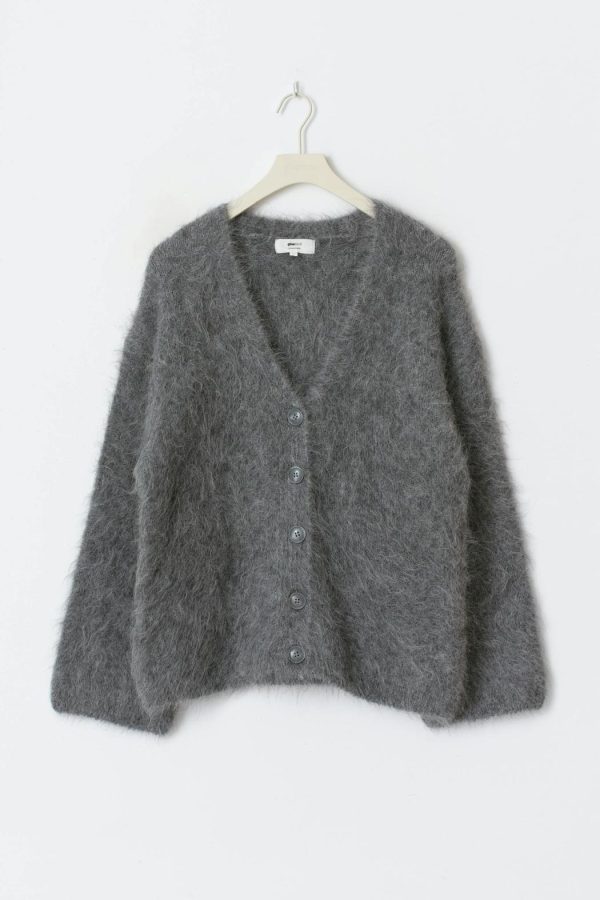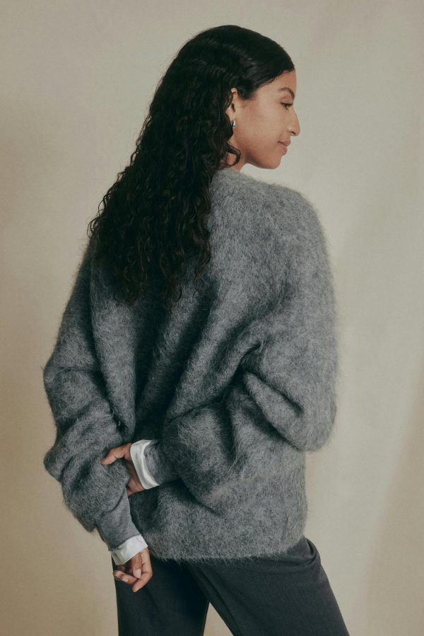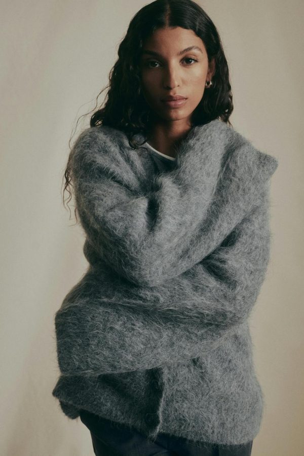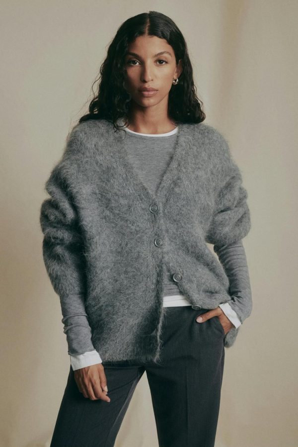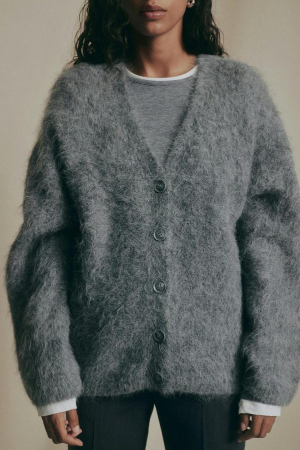 Fluffig kofta med oversize fit. Koftan är grå och har knappar framtill. Den har v-ringning, långa ärmar och ribbstickning vid ärmslut och i nederkant.
