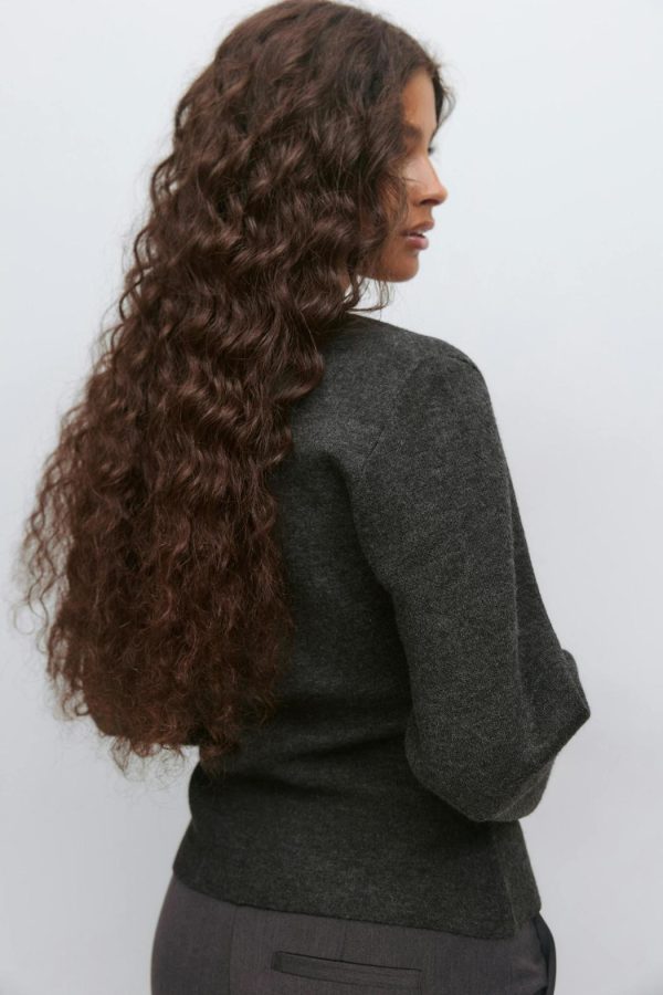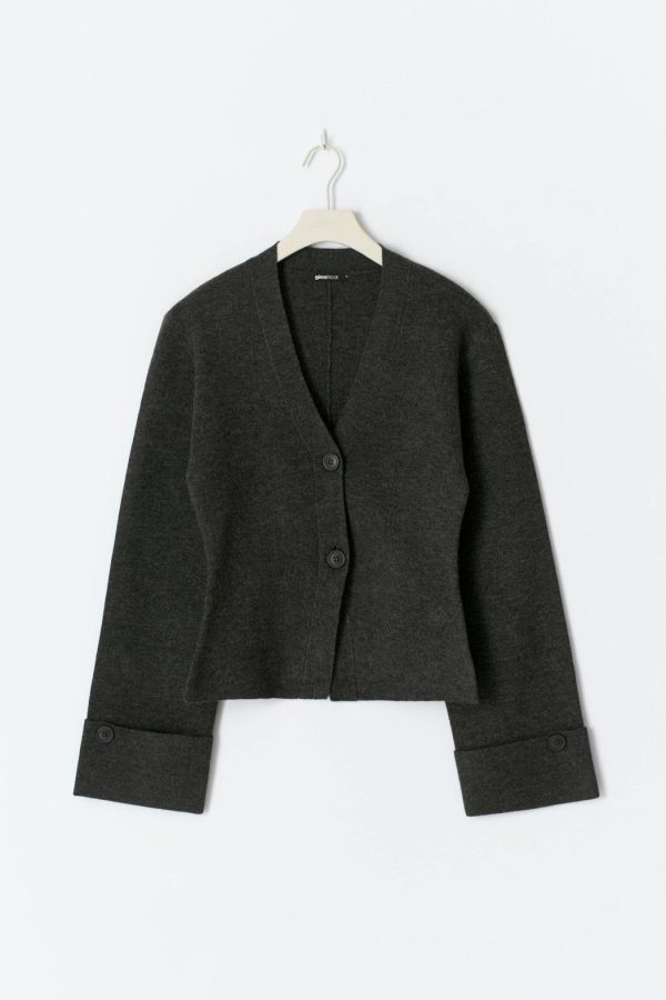 Figursydd kofta med intagen midja. Koftan är grå och har uppvikta ärmar med knappar. Den har v-ringning, lång ärm, knappar framtill och stickat material.