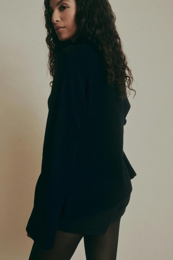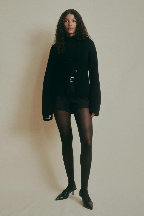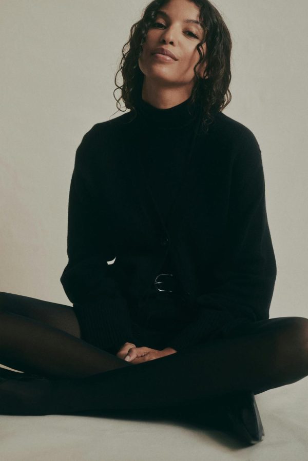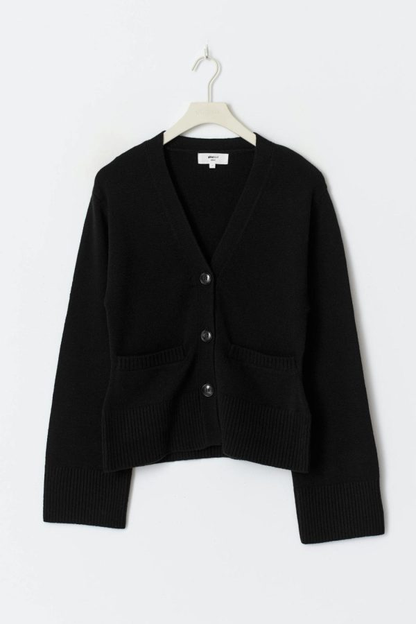 Stickad kofta i merinoull med fickor i sidorna. Cardigan är svart och har knappar framtill. Den har v-ringning, figurnära passform, långa ärmar och ribbstickning vid ärmslut och i nederkant.