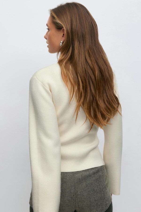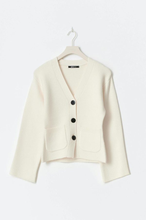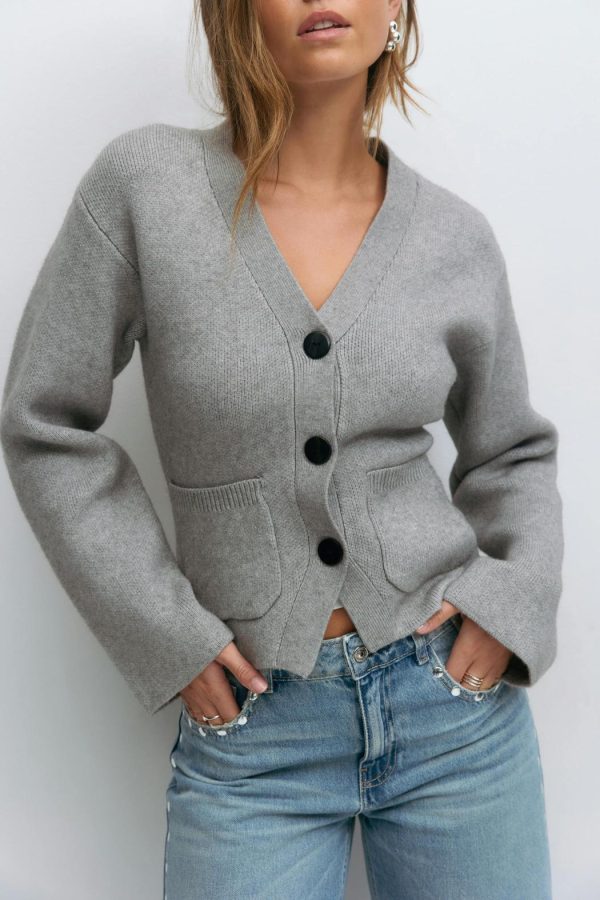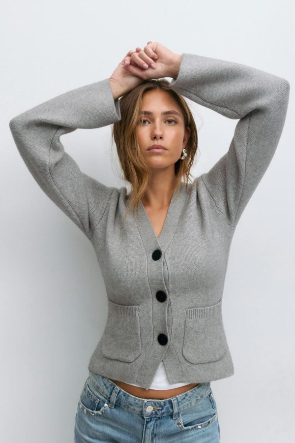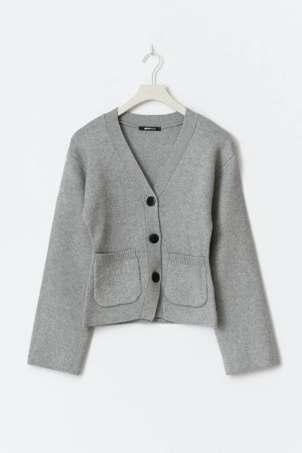 Figursydd kofta med fickor framtill. Koftan är grå och har v-ringning. Den har knappar framtill, intagen midja och normal passform.