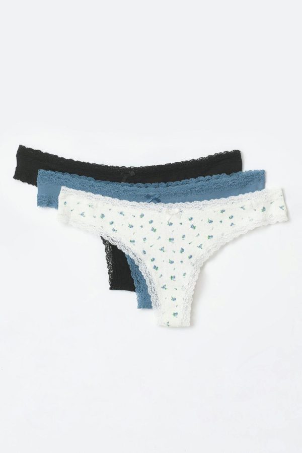 3-pack trosor i bomull med en spetskant. Trosorna är brazilian och har en låg midja. De har en fodrad gren.