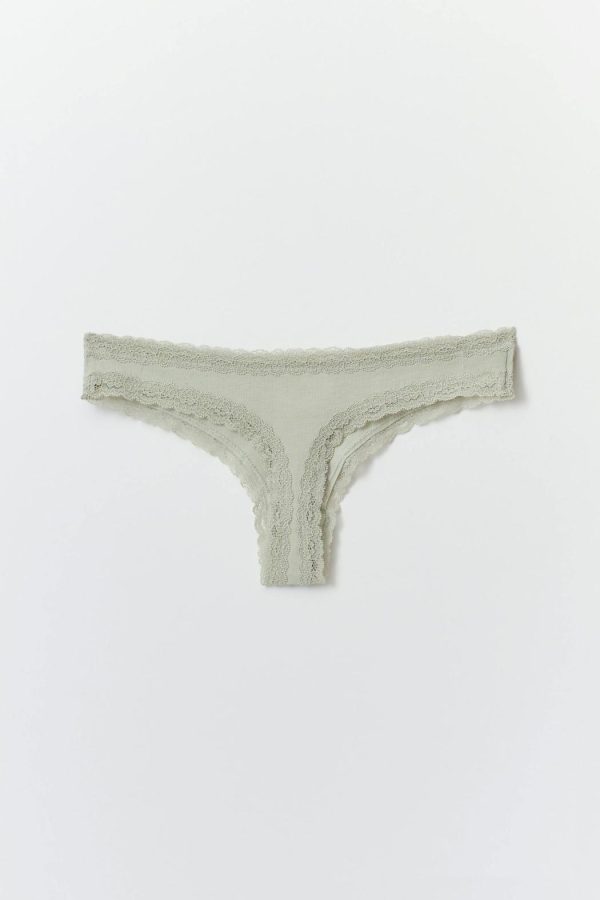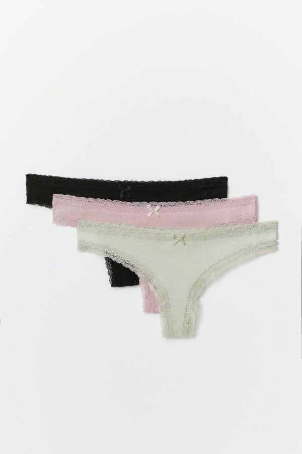 3-pack trosor i bomull med en spetskant. Trosorna är svarta, gråa, lila och brazilian och har en låg midja. De har en fodrad gren.