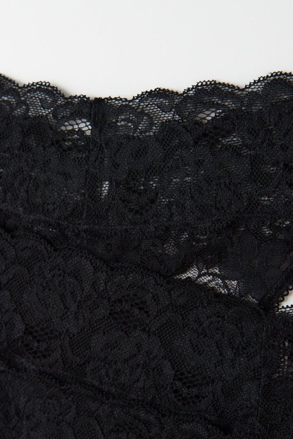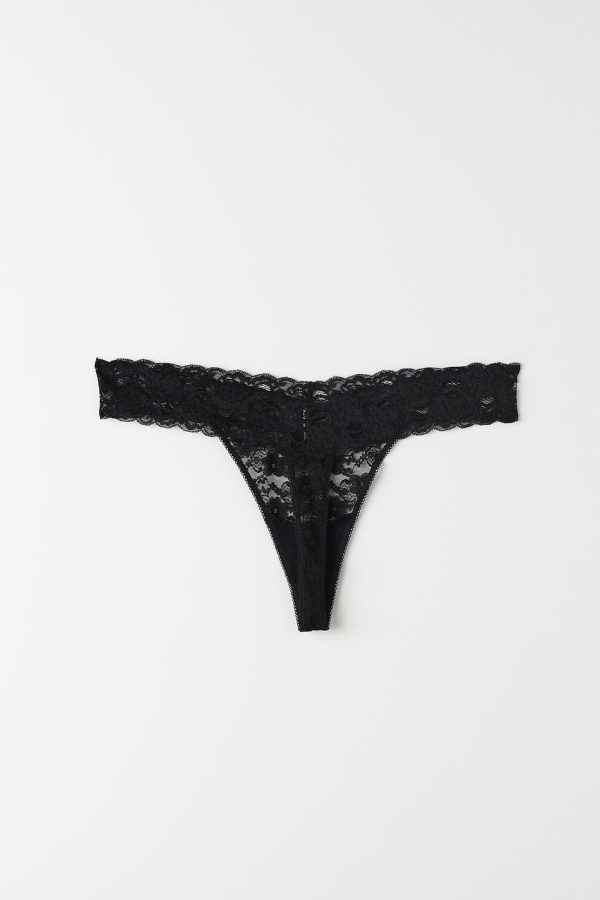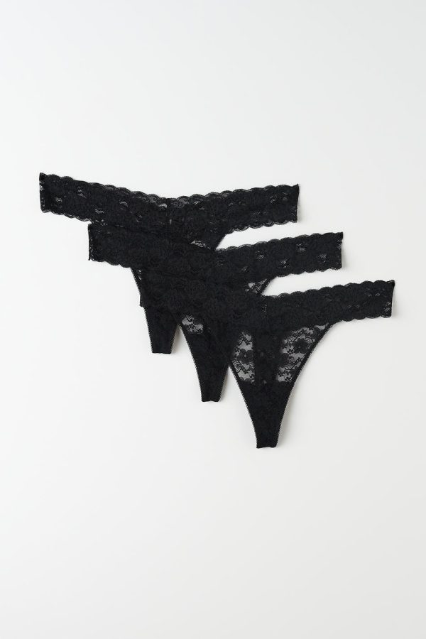 Stringtrosor i 3-pack i spets med mjuk resår i midjan. Stringtrosorna är svarta och har en fodrad gren i bomull.