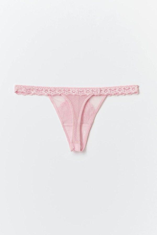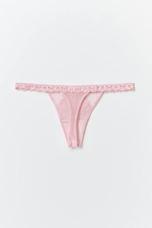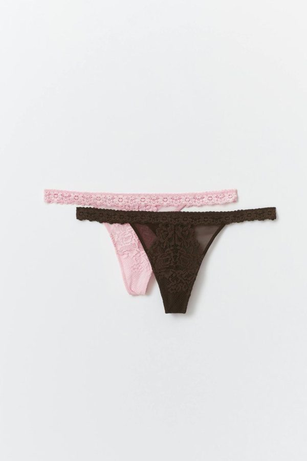 2-pack stringtrosor med spetskant. Stringtrosorna är bruna och rosa och har en låg midja. De har en fodrad gren.