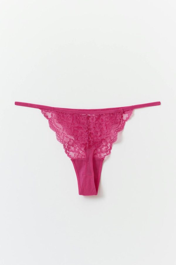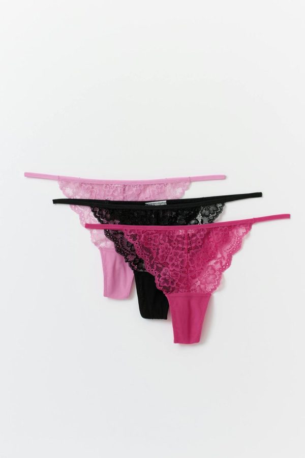 3-pack stringtrosor i spets med blommigt mönster. Stringtrosorna är rosa och har låg midja. De har fodrad gren och tunna resårband i sidorna.