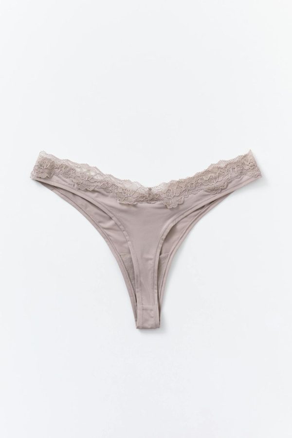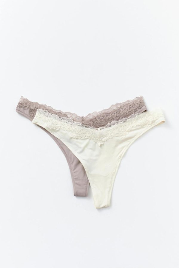2-pack stringtrosor med spetskant upptill. Stringtrosorna är vita och beigea.