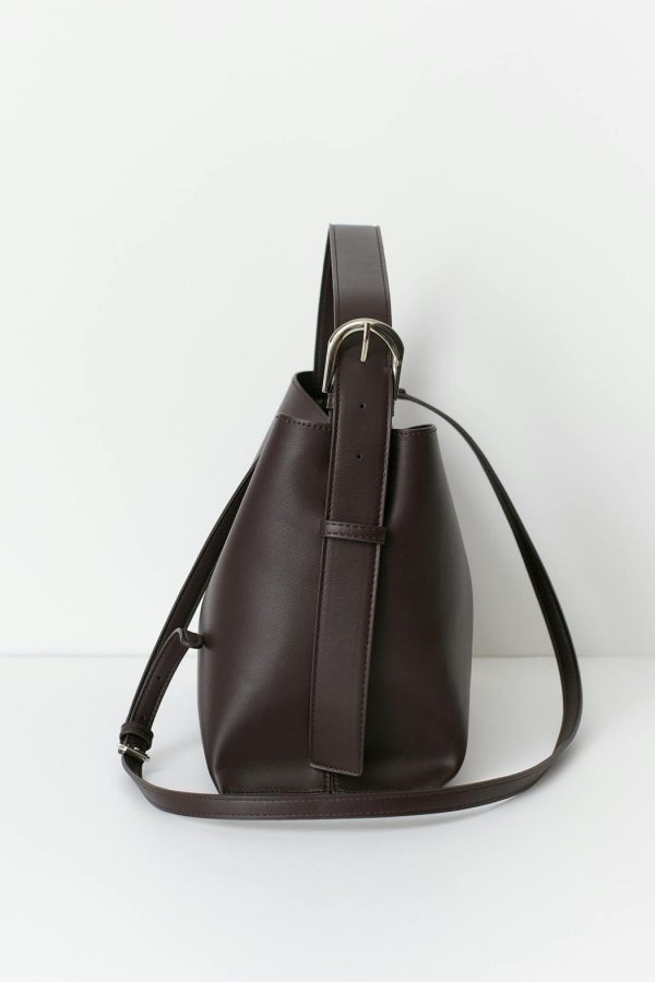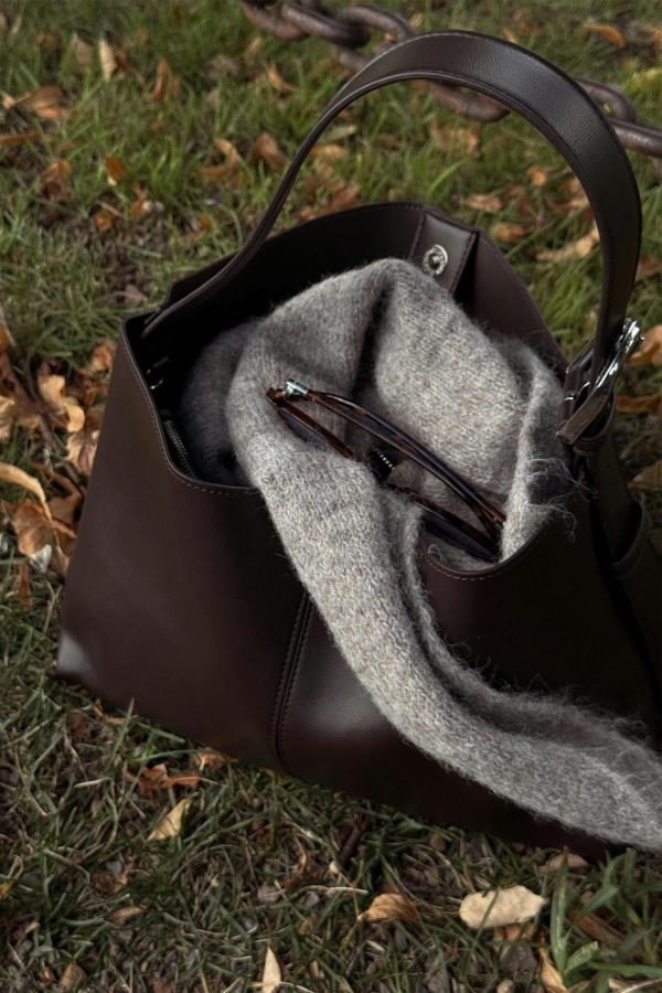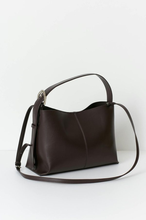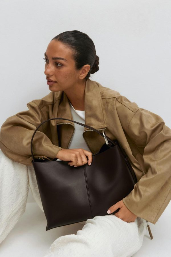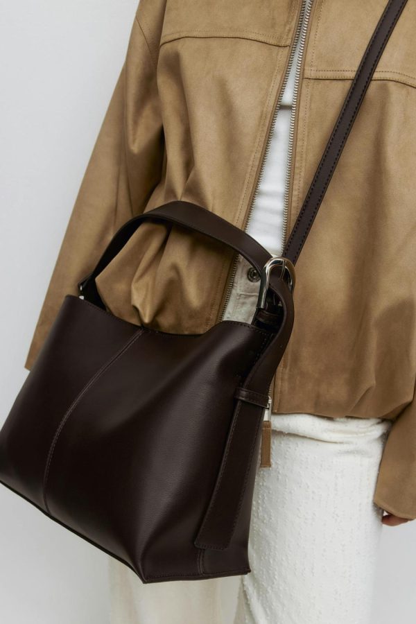 Tote bag i läderimitation med lång, reglerbar axelrem. Väskan är brun och har ett justerbart handtag upptill med silverfärgat metallspänne. Den har magnetknäppning upptill och innerficka med blixtlås. Axelrem: 130 cm.