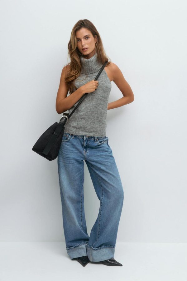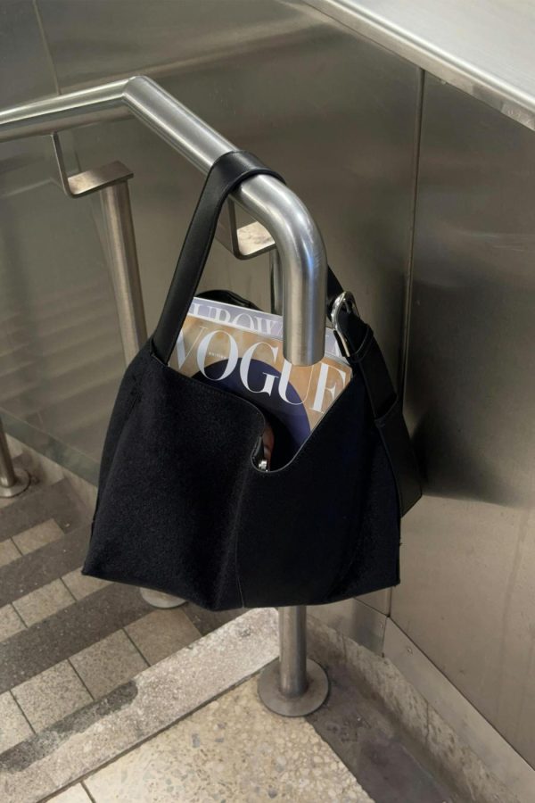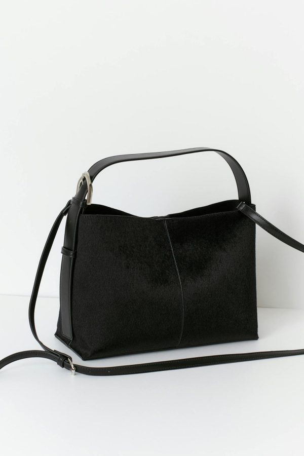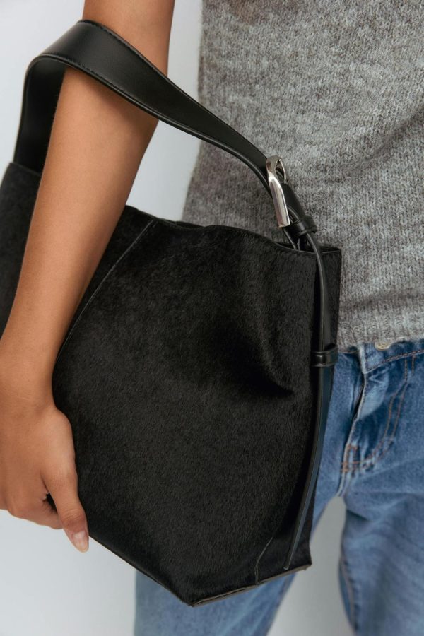 Tote bag med hårig yta. Väskan är svart och har lång, avtagbar axelrem. Den har reglerbart handtag med metallspänne, magnetknäppning och dekorativ söm framtill.