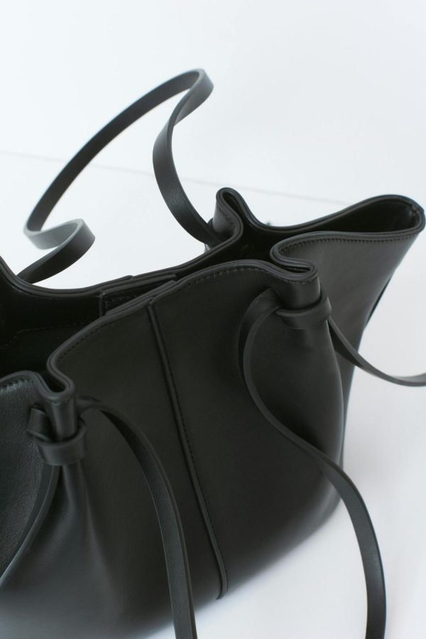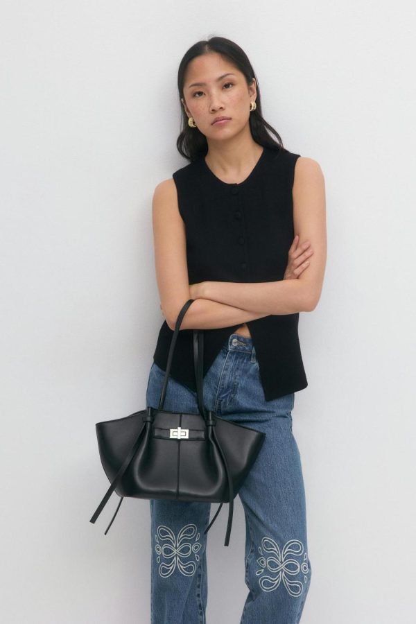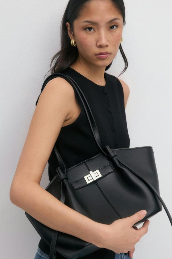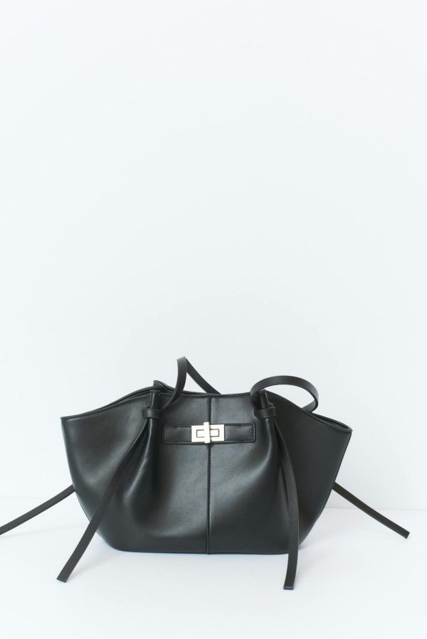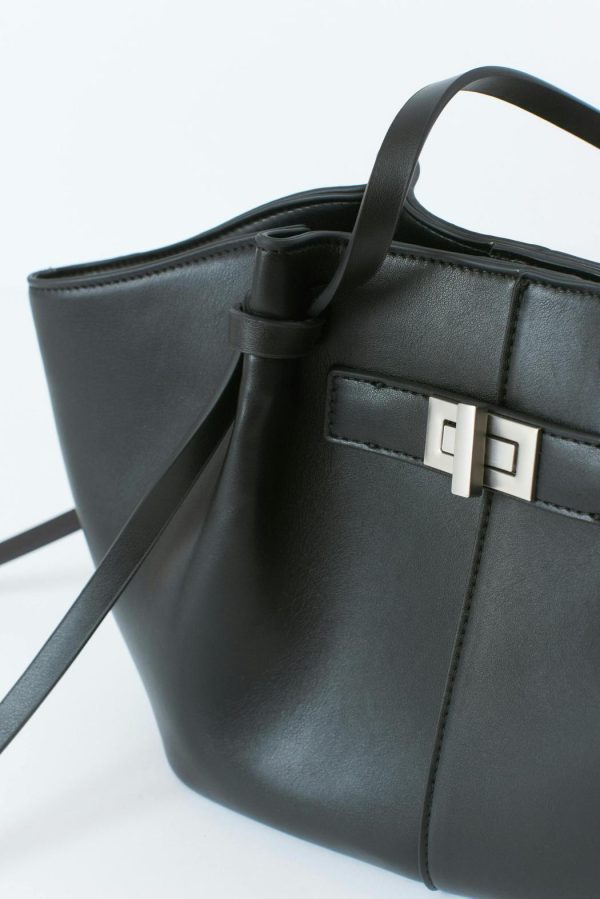 Liten väska i läderimitation med dubbla handtag. Väskan är svart och har silverfärgat spänne. Den har magnetknäppning och innerfack.