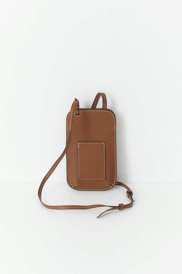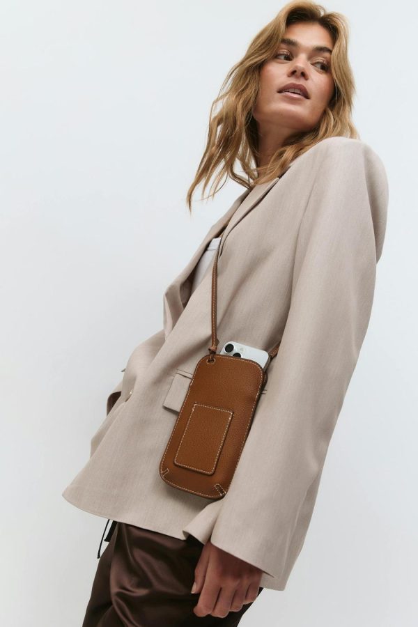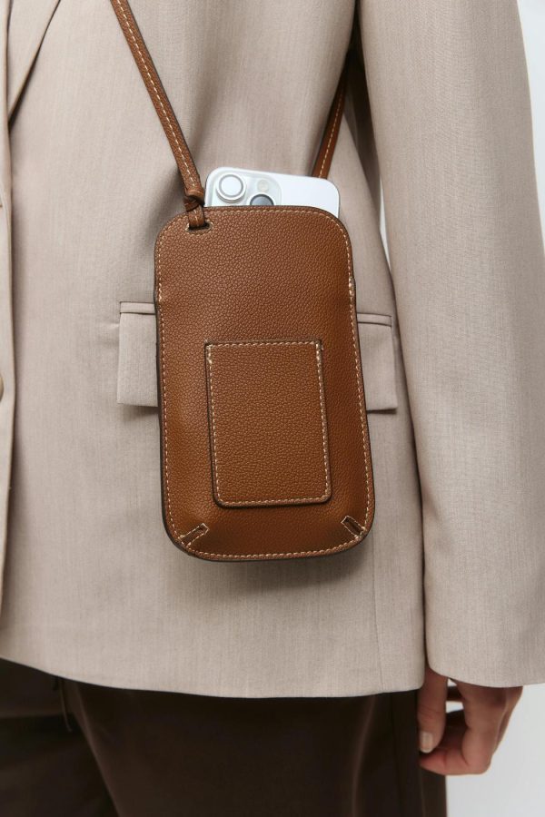 Mobilväska i läderimitation med en justerbar axelrem. Väskan är brun och har en ficka fram.