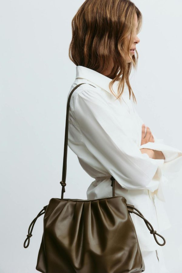 Väska med rynkad design. Väskan är brun och har långt, justerbart axelband. Den har en magnetknäppning, fodrad insida och reglerbara dragskor i sidorna.