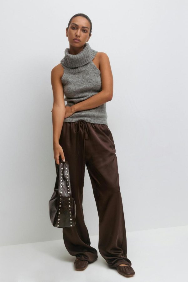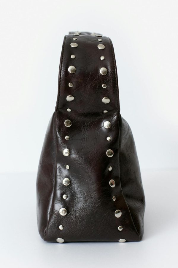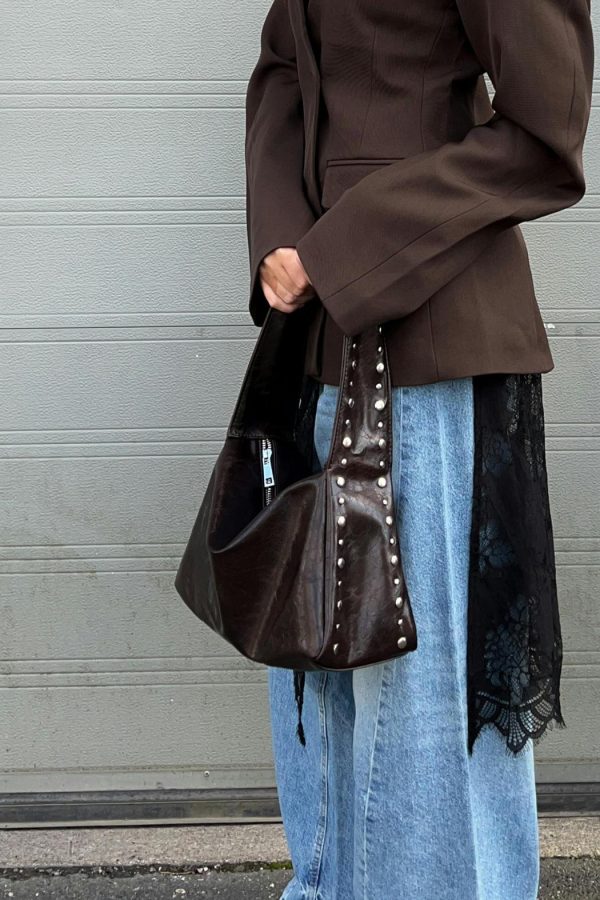 Fyrkantig väska i läderimitation med nitar. Väskan är mörkbrun och har kort, bred axelrem. Den har dragkedjestängning upptill.