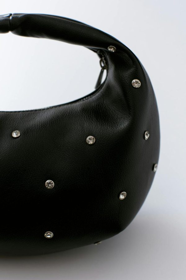 Detail: Rhinestone, Studs, Lining, Inner zip pocket, Zip closure Description: PU, Silver Hardware Additional Description: Drop handle: 10 cm