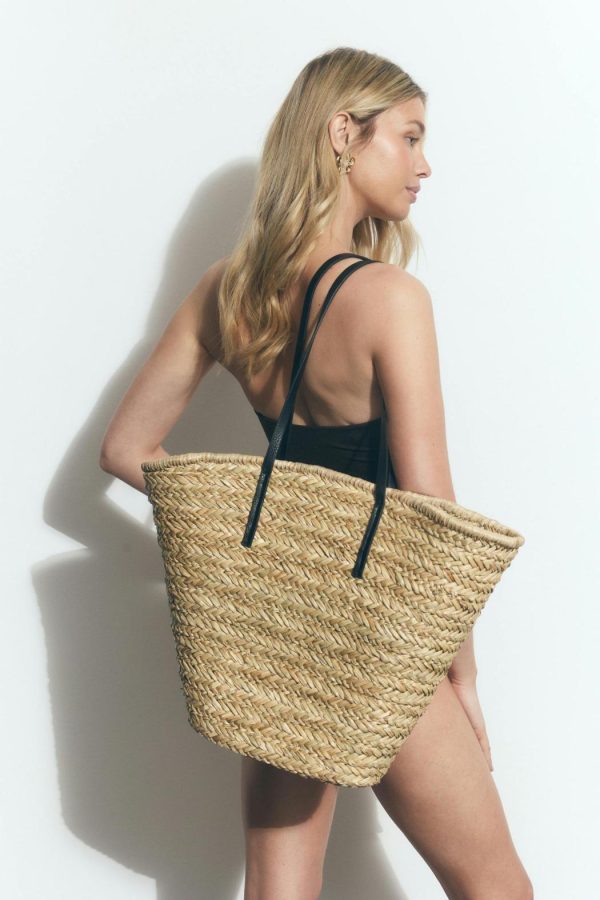 Stor stråväska med handtag i läderimitation. Väskan är beige och har flätad design.