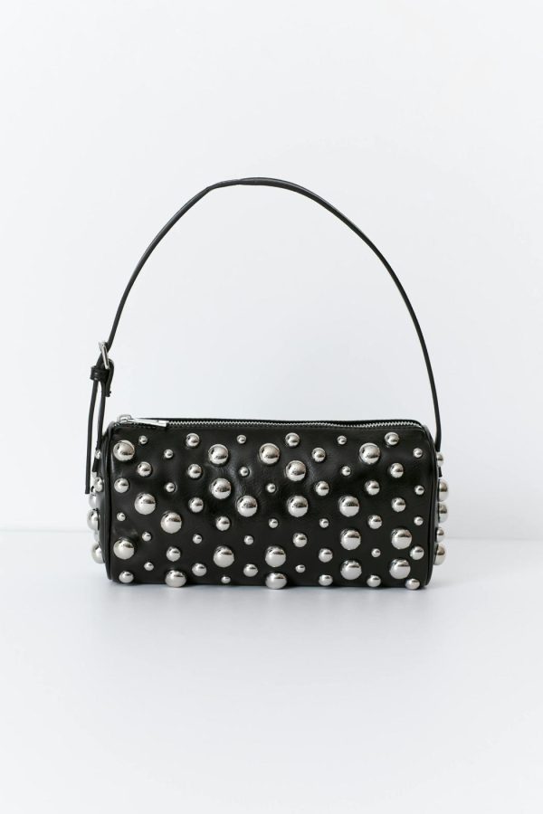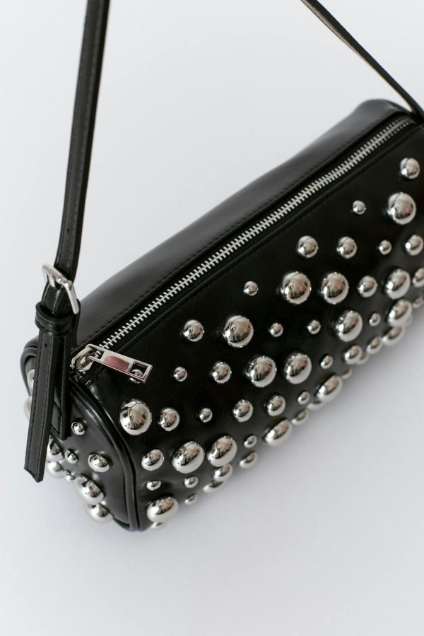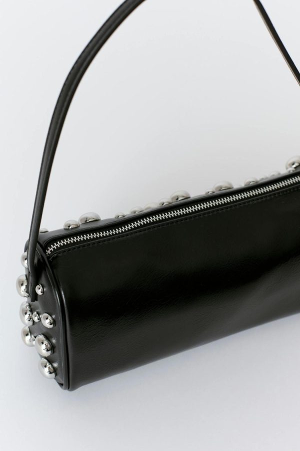 Axelremsväska i läderimitation med stora, runda nitar framtill. Väskan är svart och har cylinderformad design. Den har kort, reglerbar axelrem med silverfärgat metallspänne och stängning med dragkedja upptill.