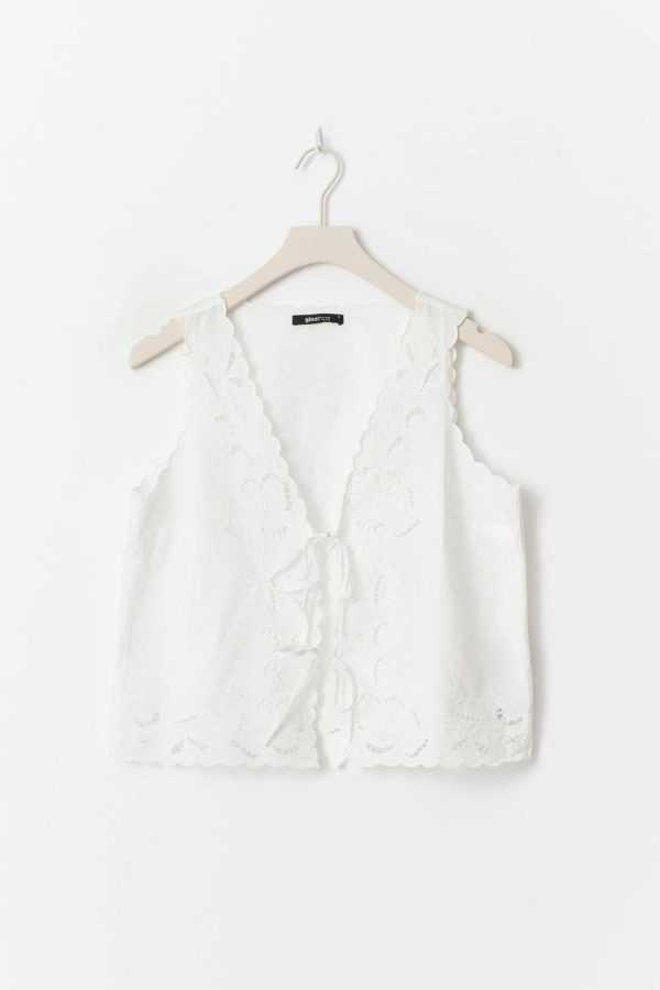 Väst med broderi. Västen är vit och har v-ringning. Den har knytningar framtill och normal passform.