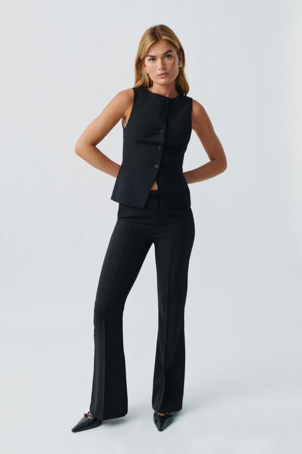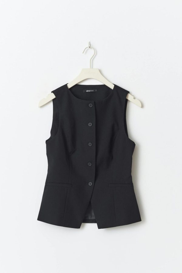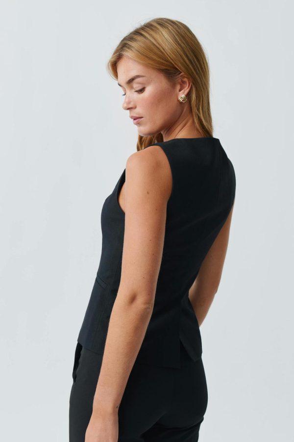 Kostymväst med knäppning fram. Västen är svart och har hög halsringning.