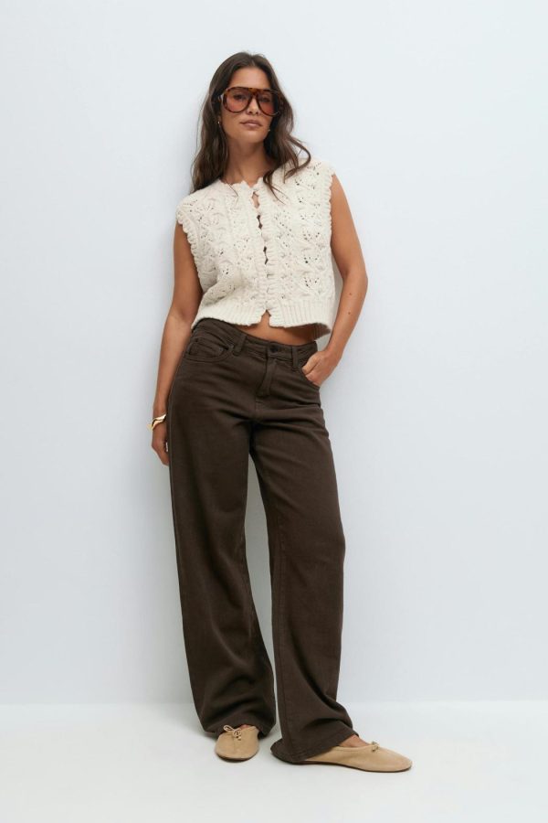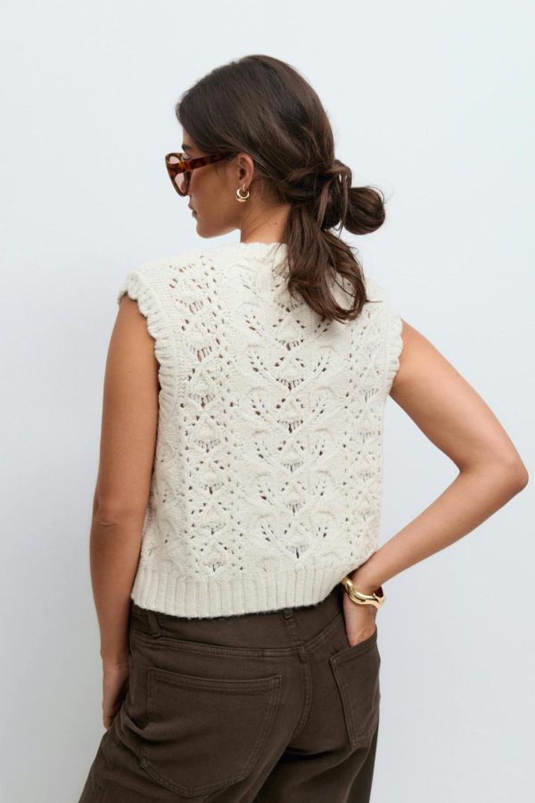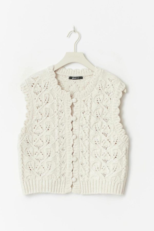 Stickad väst med ett spetsmönster. Västen är naturvit och har en ribbstickning i nederkant. Den har knappar fram.