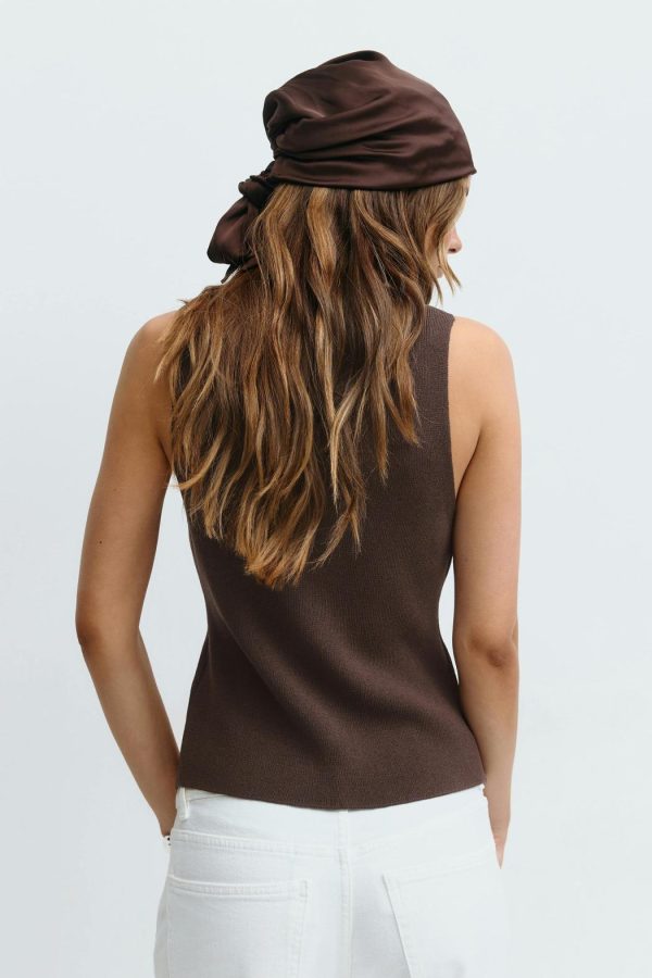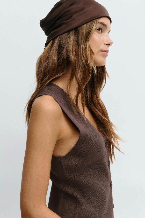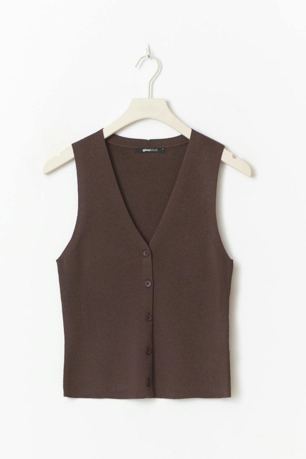 Stickad väst med knappar framtill. Västen är brun och har en v-ringning. Den har en ribbad kvalitet och normal passform.