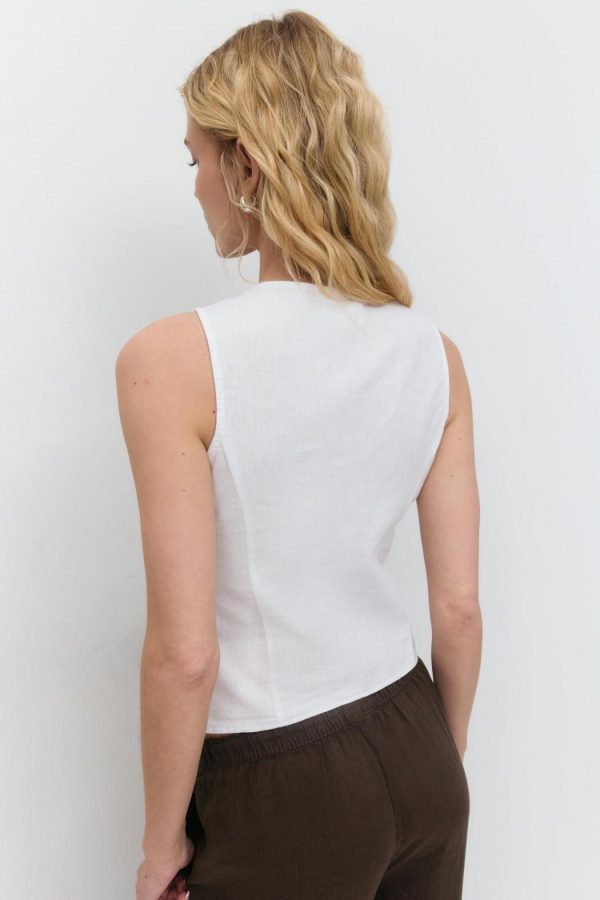 Linneväst med knytstängning fram. Linnevästen är vit och har v-ringning.