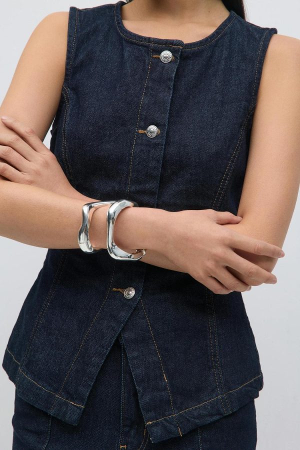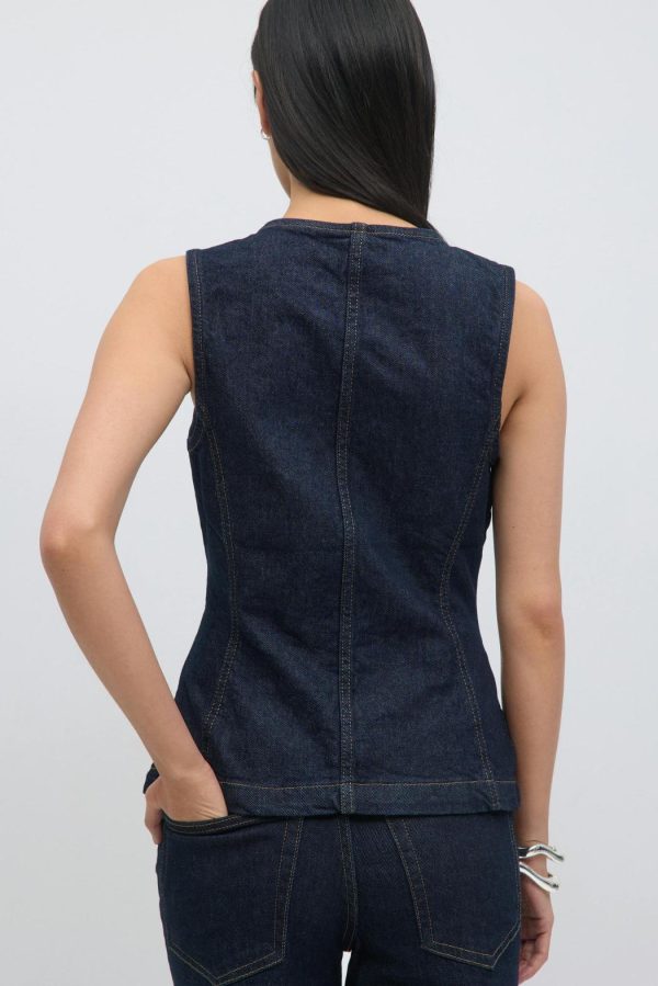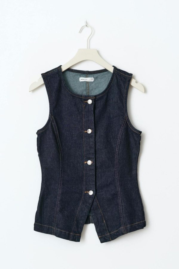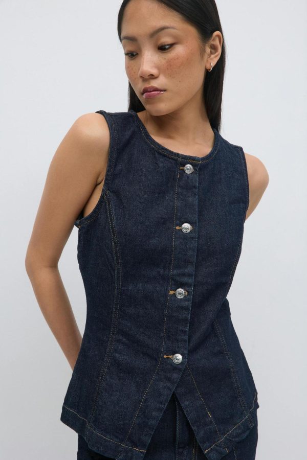 Jeansväst med stretchig kvalitet. Jeansvästen är mörkblå och har knäppning framtill. Den har rund halsringning och figurnära passform.