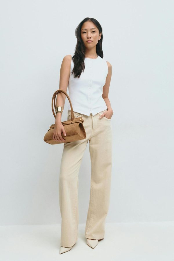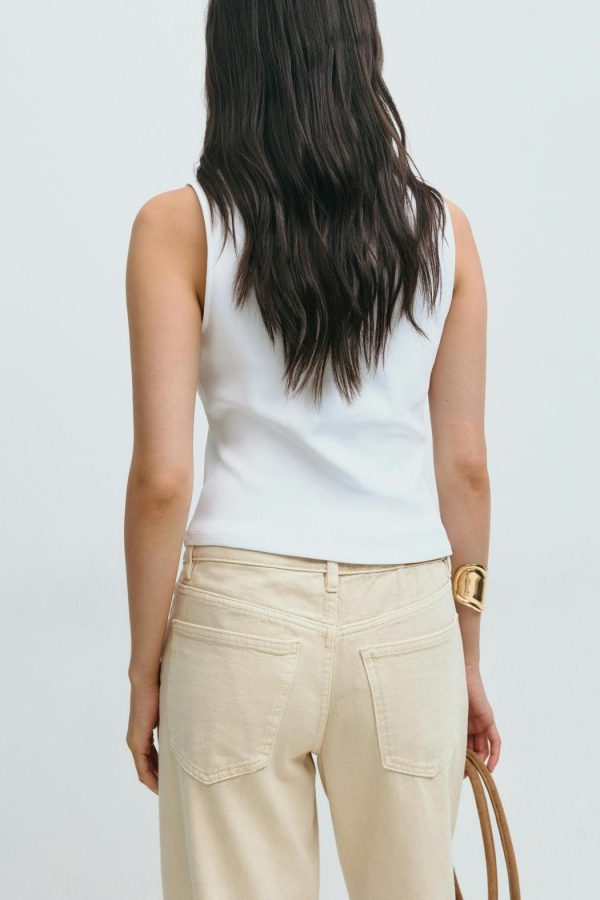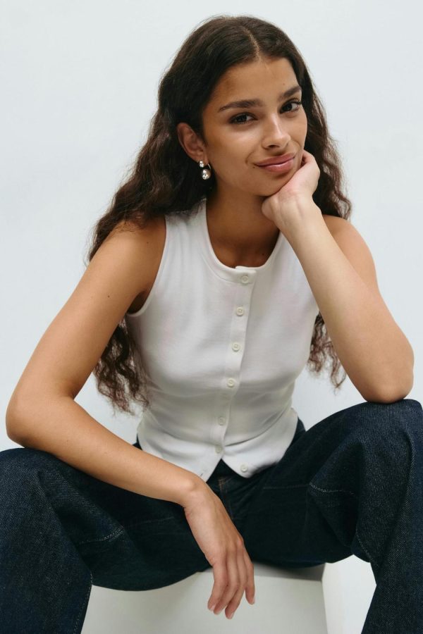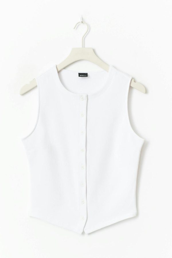 Väst med knappar framtill. Västen är vit och har rund halsringning. Den har figurnära passform, croppad längd och ärmlös design.