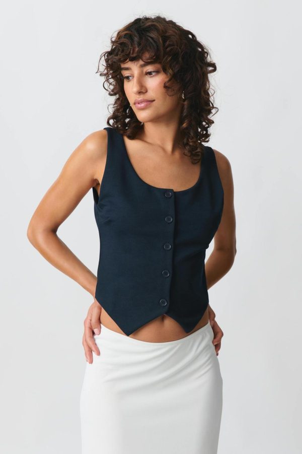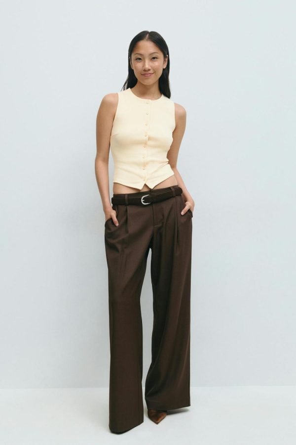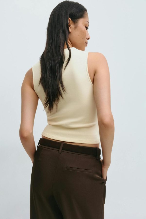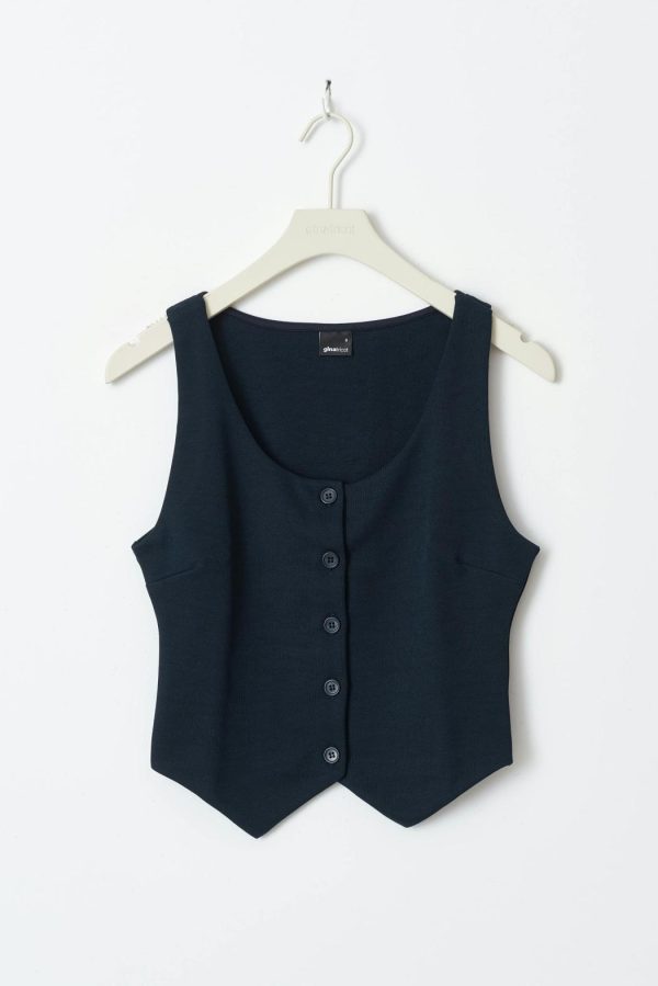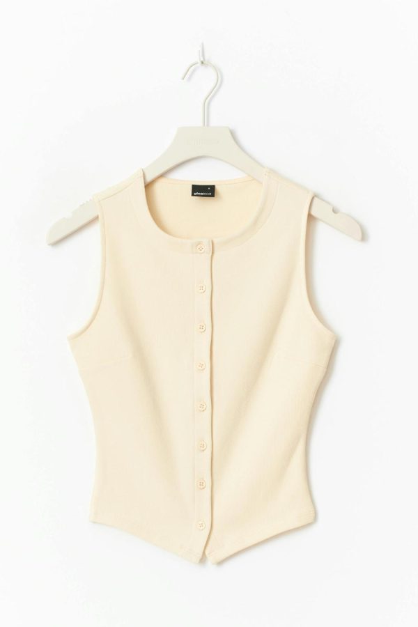 Väst med knappar framtill. Västen är gul och har rund halsringning. Den har figurnära passform, croppad längd och ärmlös design.